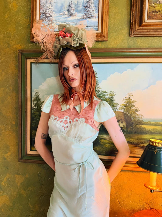 Stunning Antique 1930’s Silk Bias Cut Gown in a Rare Mint Green and Burnt Umber Color-Way