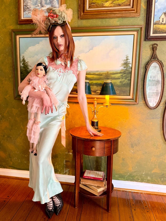 Rare Ethereal Antique 1930’s Mint Bias Cut Silk Slip Dress with Burnt Umber Lace Detail