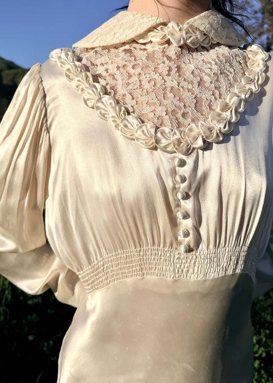 Romantic Antique 1930's Bias Cut Charmeuse Satin Wedding Gown in Candlelight with Rosette Details