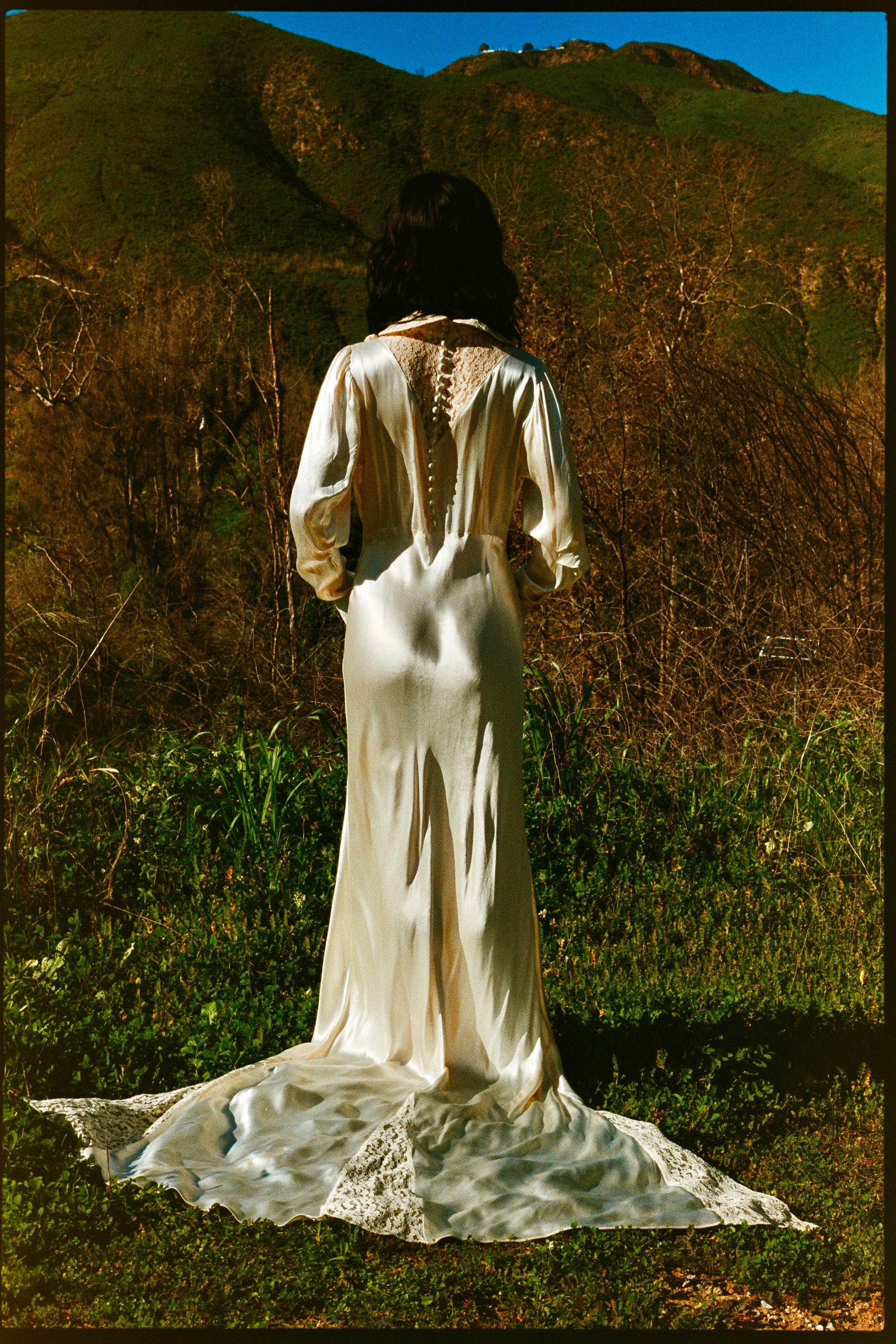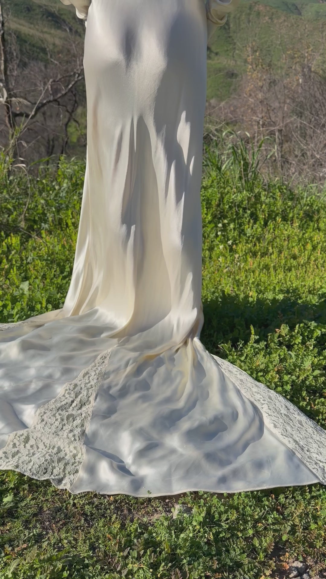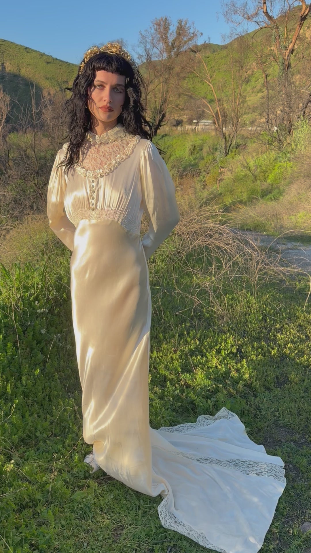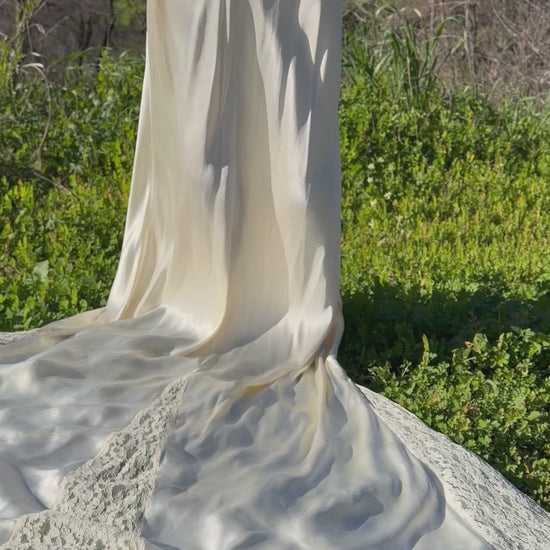 The fabric is a high quality, luminous, acetate satin charmeuse with fibers that are in strong condition, leaving lot's of life and wearability in this work of art. You'll embody a living goddess as the bias cut creates a sophisticated and feminine silhouette which hugs every curve. A small wristlet loop (moreso a finger loop) is attached on the inside of the train.