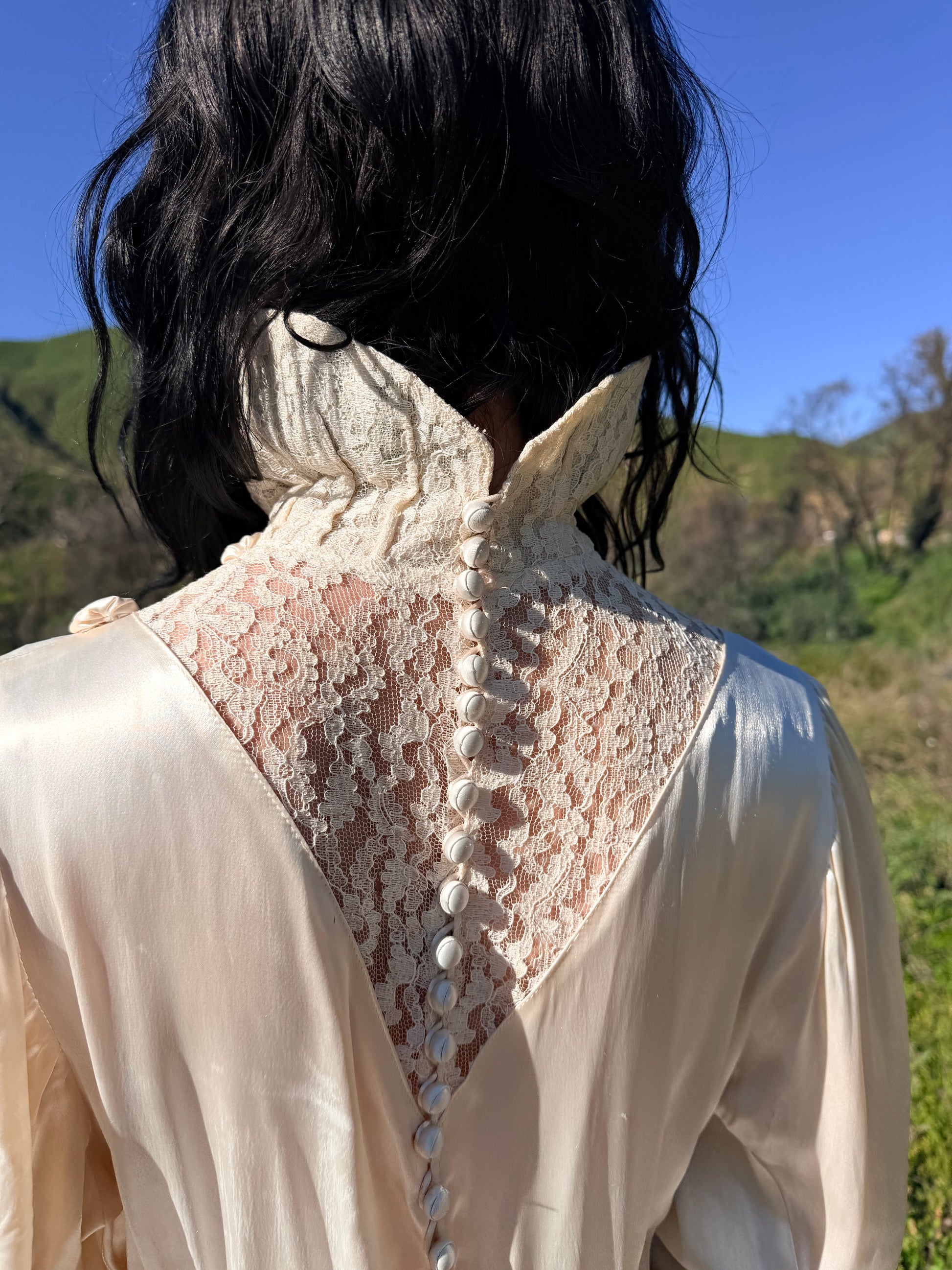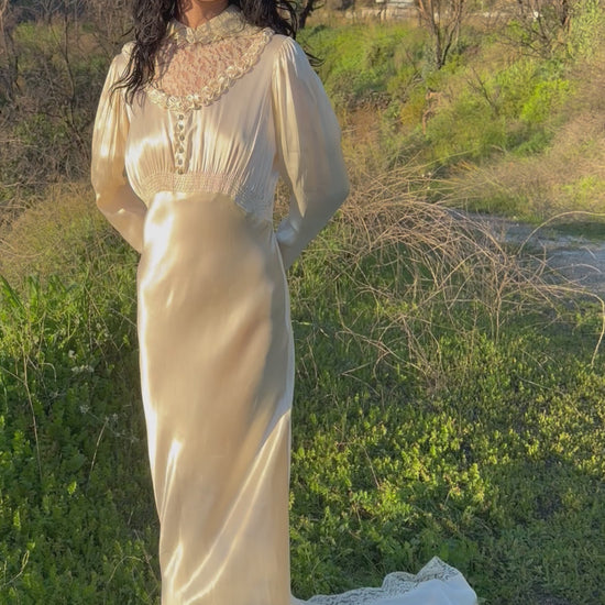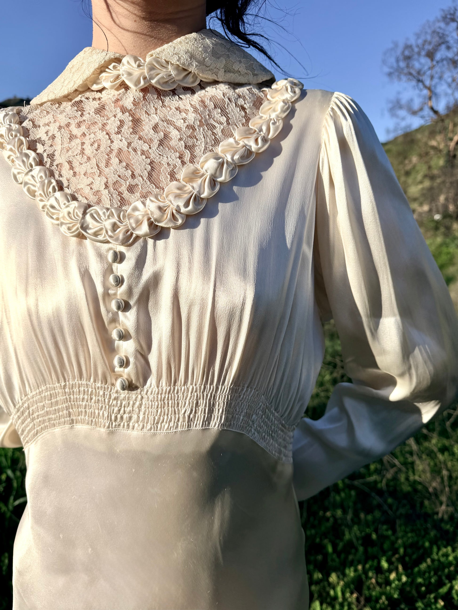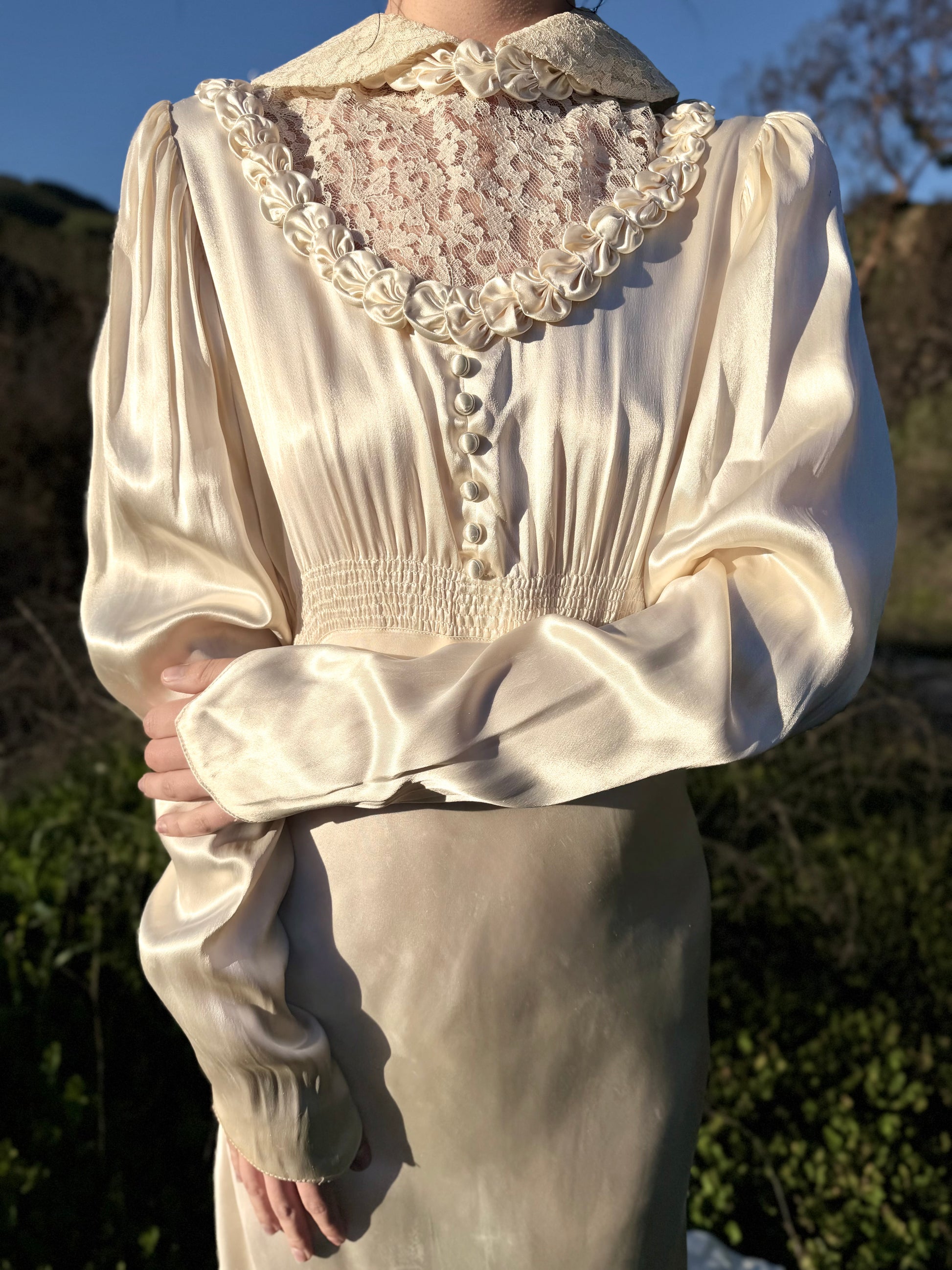 Pristine, elegant, Old Hollywood-esque antique 1930's wedding gown fit for the silver screen! This rare, one-of-one candle light satin wedding gown contains one striking detail after another. Fit with a scalloped rosette satin trim detail tucked beneath the Peter Pan style collar, which, can be worn standing up. The lace bodice details are unlined in back and front, adding a sexy sultry feel. The soft “U” shaped lace bodice is lined with more scalloped rosettes. Below sit 6 fabric covered round buttons, with two inches of ruching at the empire waistline. Constructed with elegant Dolman sleeves that taper to a fitted wrist point, with four tiny metal snap ins. The backside contains a deep v shaped lace detail, 21 ball shaped buttons down the spine, with 21 satin button loops in perfect condition.