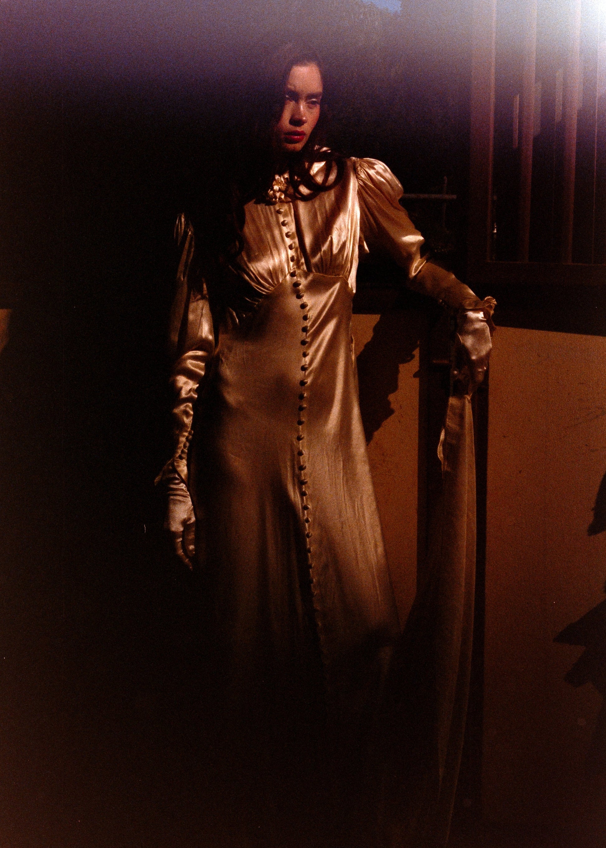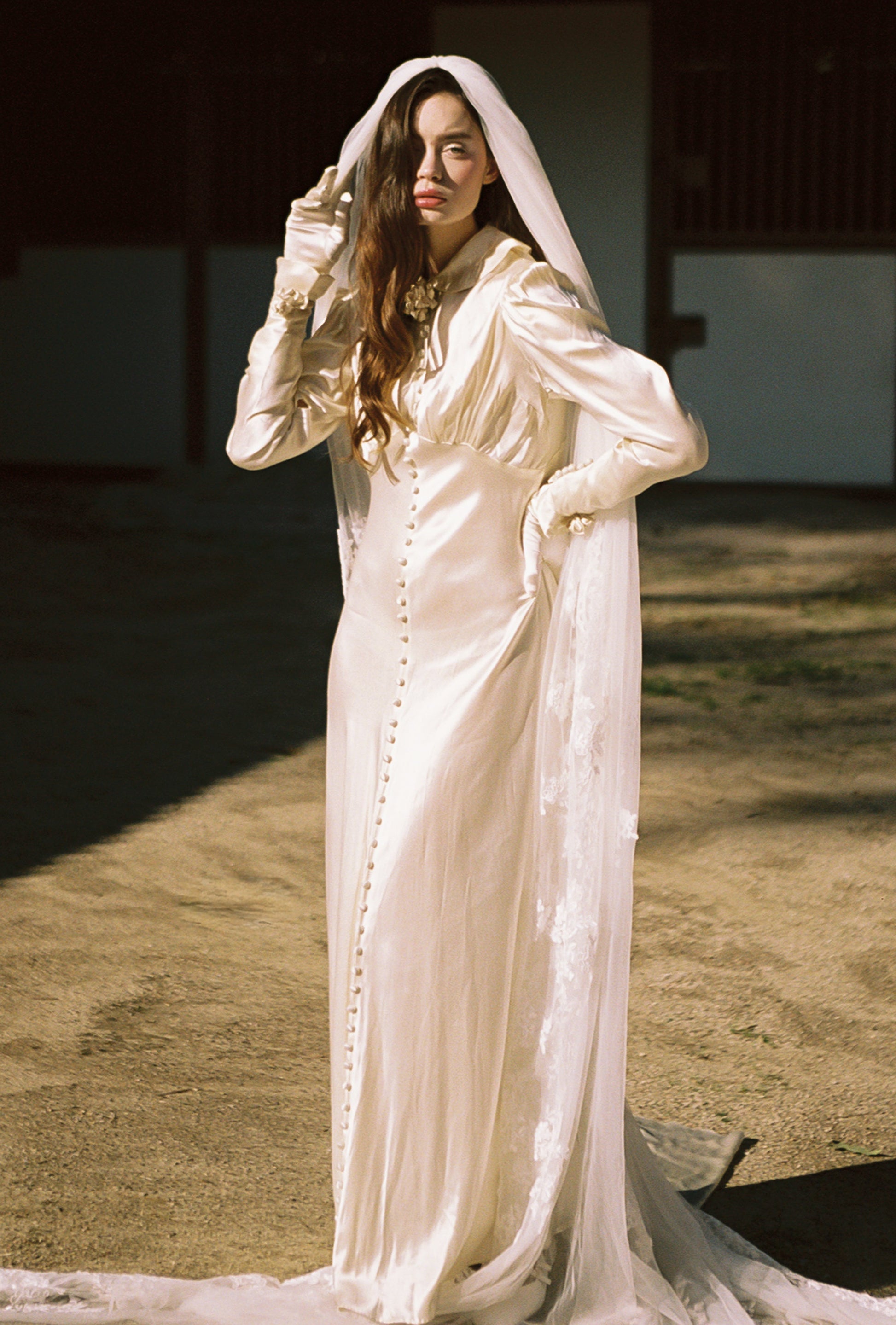 Step into Old Hollywood romance with this breathtaking authentic antique 1930s warm ivory silk charmeuse wedding gown, a rare piece of bridal history that beautifully captures the glamour and elegance of the 1930's bygone era. With its luminous drape, sculptural seams, and handcrafted detailing, this gown is an heirloom-quality treasure for collectors, stylists, and vintage-loving brides.