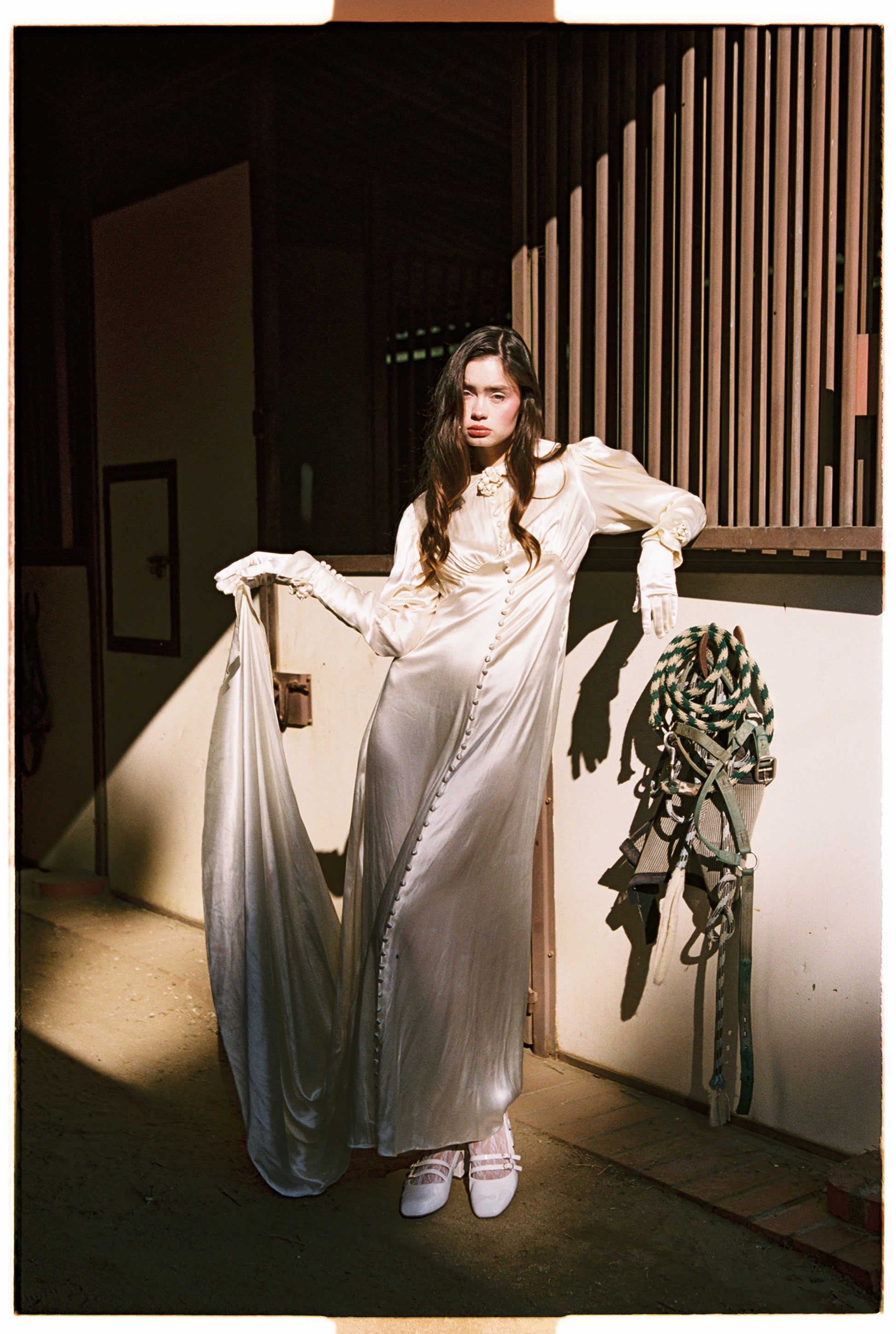The warm ivory liquid silk charmeuse fabric boasts a luminous sheen that glides over the figure, designed with an inverted V waist that gathers gently beneath the bust, as if drawn there by breath alone.