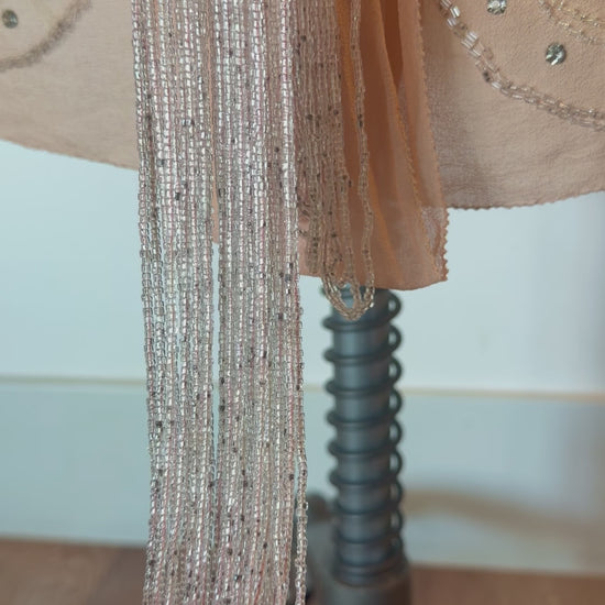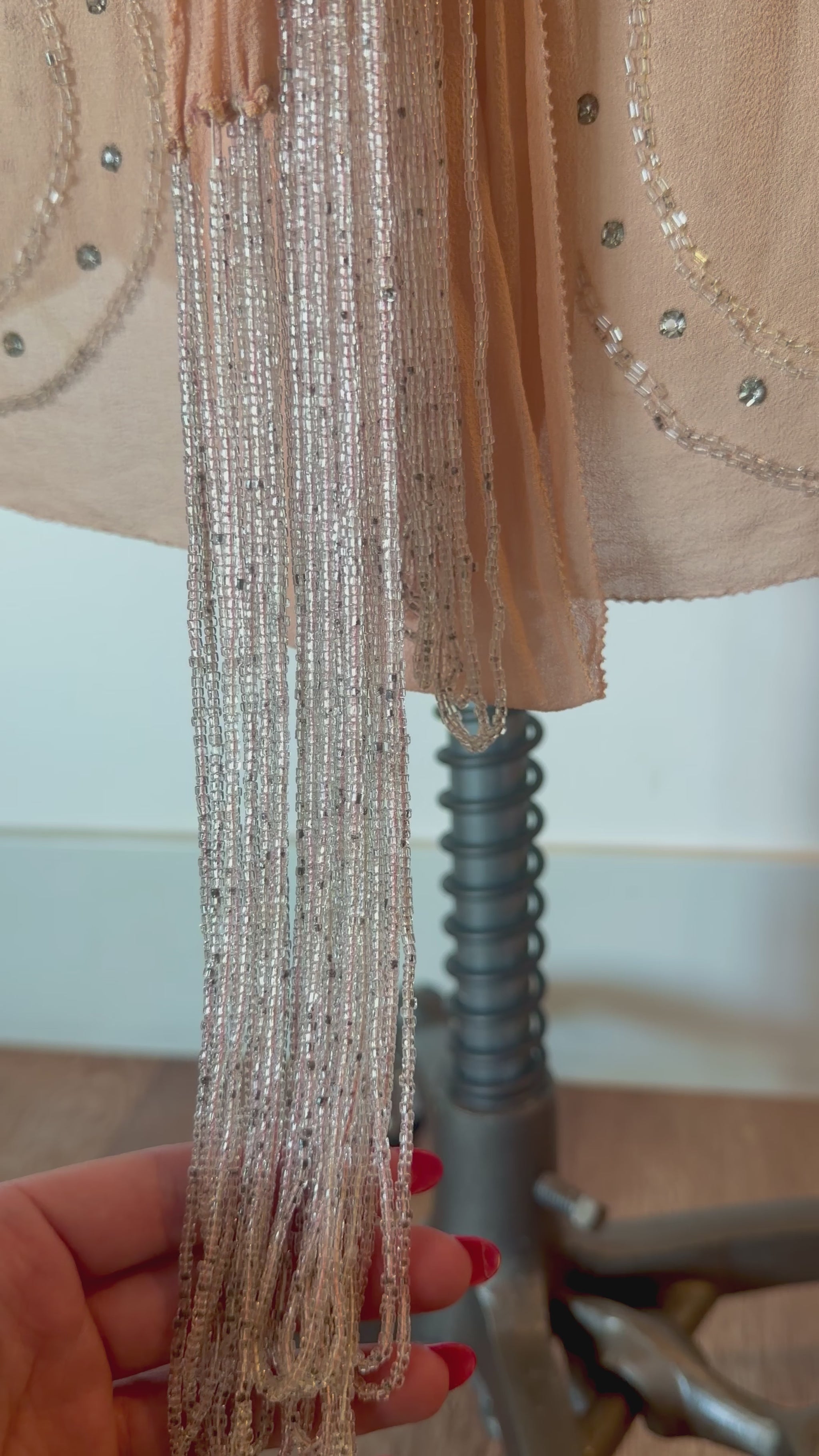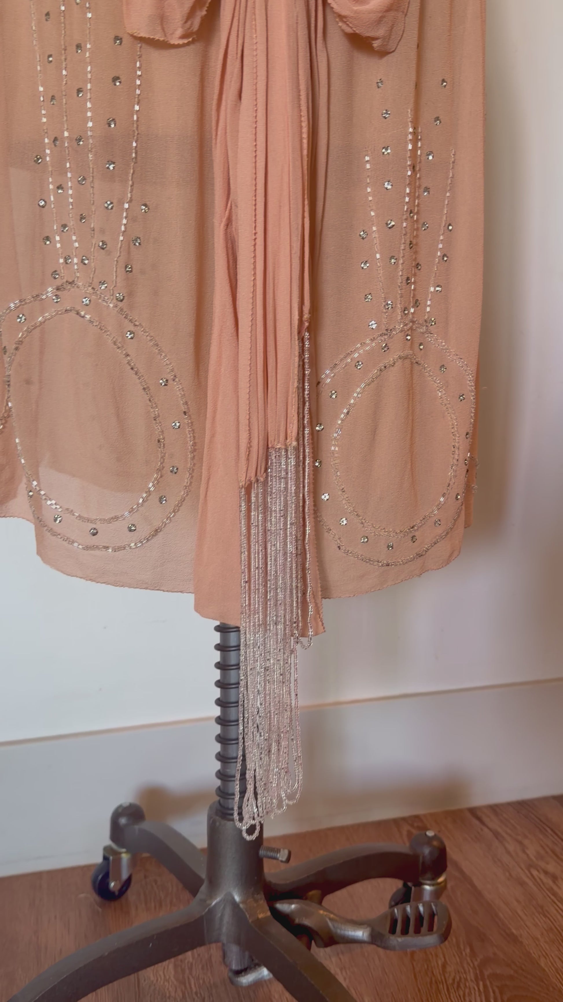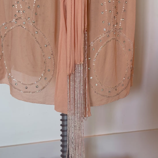 Rare, Angelic, Art Deco Antique 1920’s Silk Chiffon Dress in Peachy Pink Glass Rhinestones and Silver Microbead Tassles