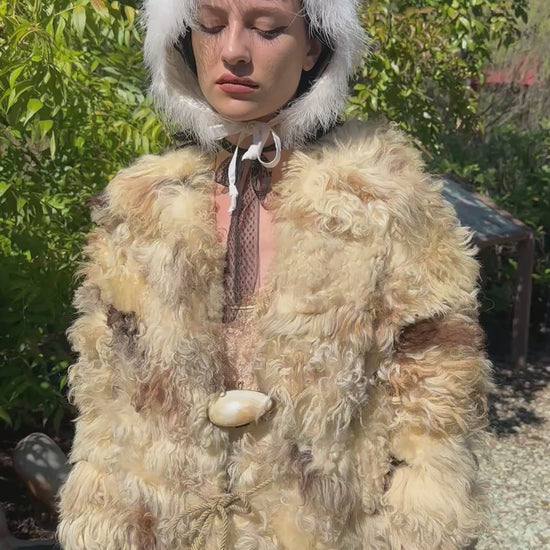 The natural curl and movement of the Mongolian lamb give this jacket its unmistakable texture — luxurious, dramatic, and unmistakably glamorous. The sheep fur is incredibly soft, and has been preserved extremely well considering age and fur type. The interior is fully lined in cocoa silky satin fabric with an embroidered VAR monogram on the inside right panel. Giving it a bespoke, couture feel. This jacket was clearly owned by someone from high society as monograms were (and still are), a very expensive add on detail. Functional yet elegant, the jacket features two front pockets, lined in matching silky satin fabric, topped with a single mid-front clasp to create a clean silhouette. Suitable for sizes XS-L.