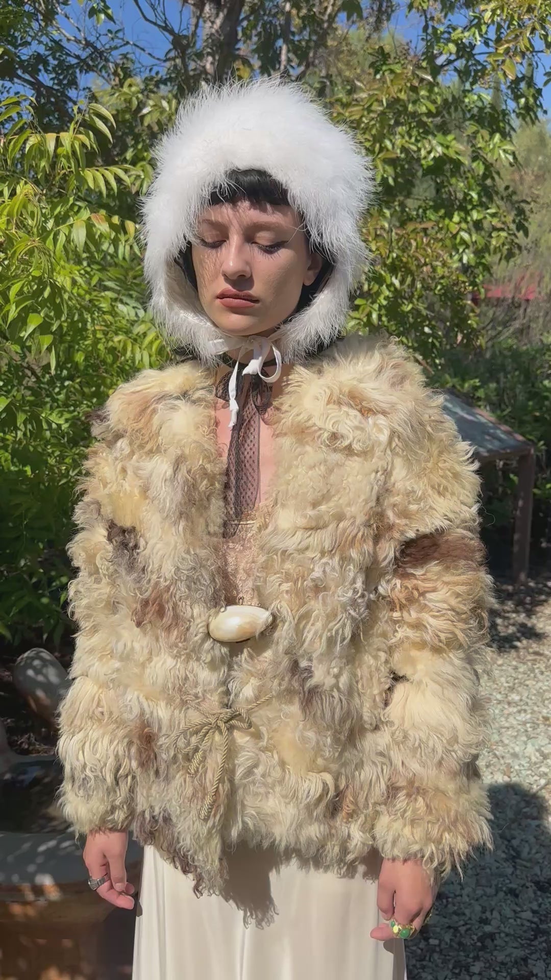 Stunning vintage 1970’s Mongolian sheep fur coat jacket in Oreo. A cozy, must have garment for those who are connoisseurs of vintage furs, love 70’s boho-esque style, and for those with a penchant for owning pieces no one else will have. Designed by: Jacques Saint Laurent. This particular curly haired Mongolian jacket is a stand out from others due to the unique color way patches of cream, light brown, chocolate, and deep espresso fur. I’d like to think the color combo resembles an Oreo cookie.